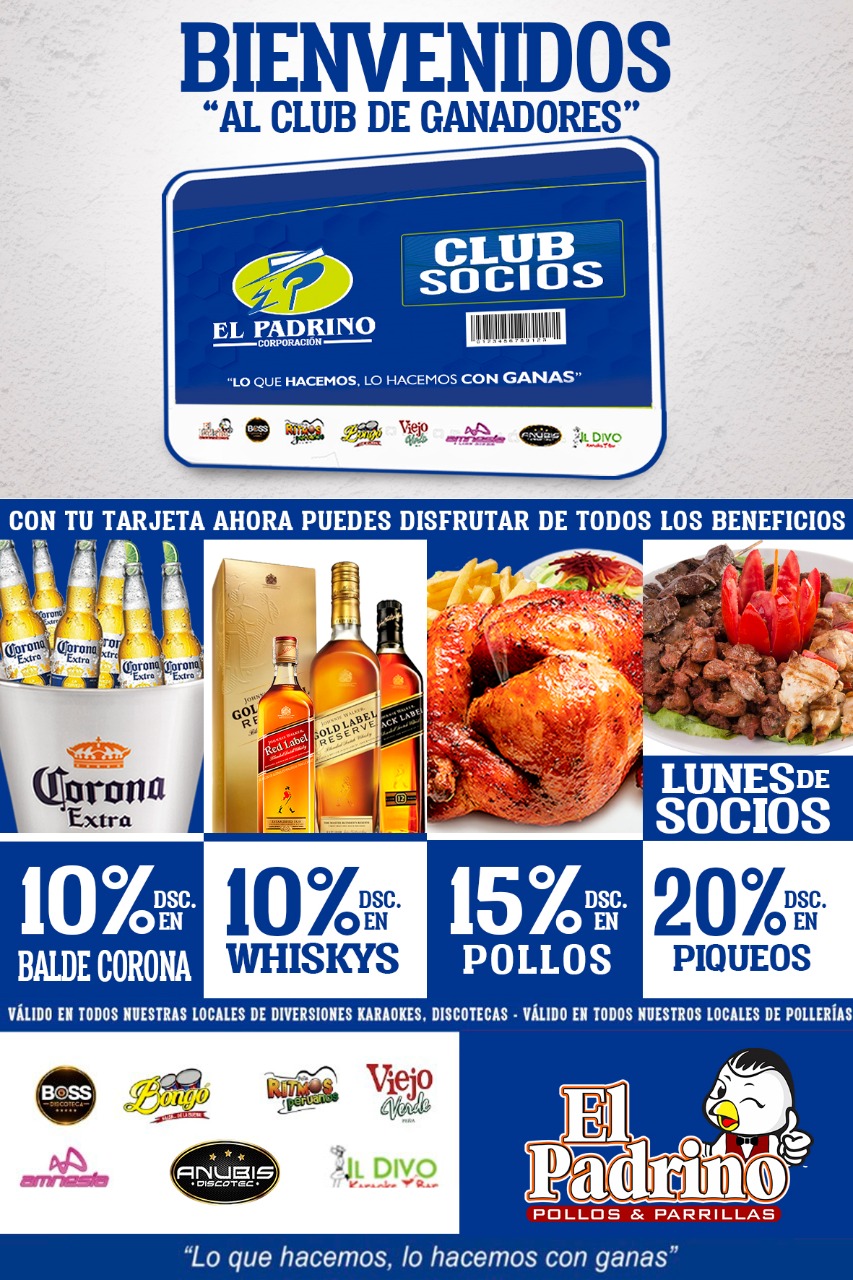 ¡Pertenecer al club de socios te da derecho a obtener descuentos exclusivos en El PADRINO CORPORACIÓN. Con está tarjeta obtendrás descuentos en nuestros establecimientos de Pollerias, Discotecas y Karaokes.